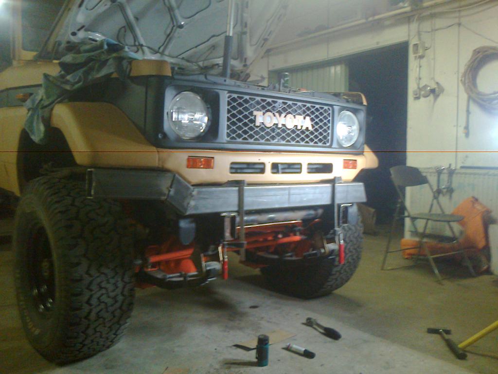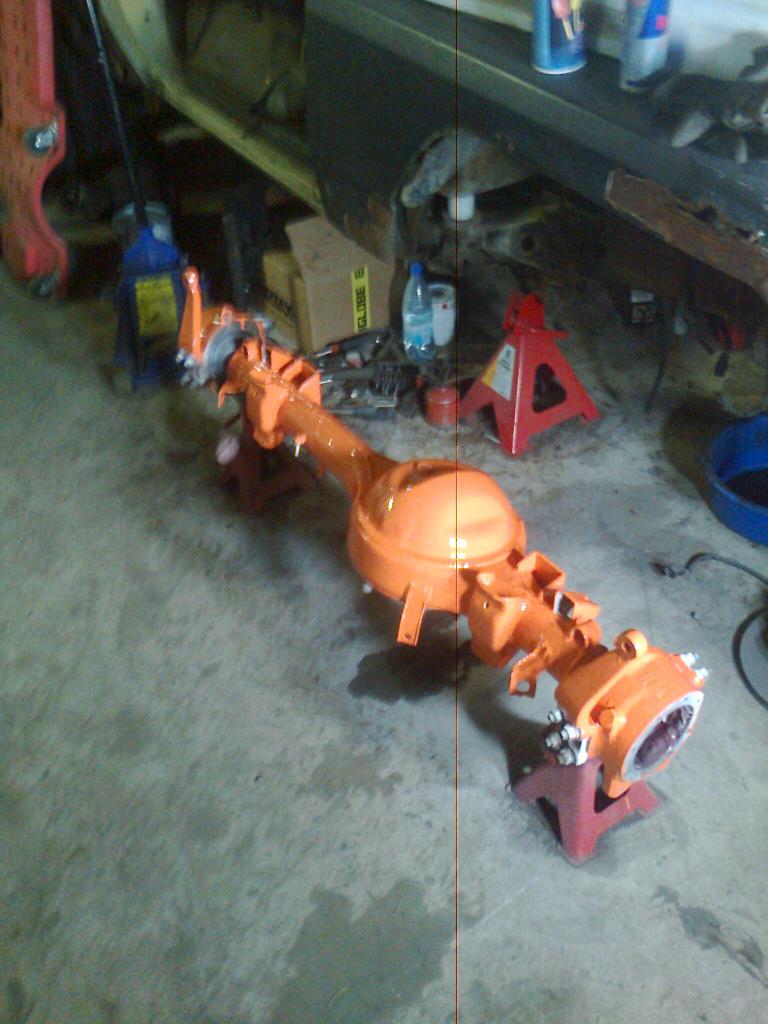 Vanhalle etuakselille sai näyttää vähän laikkaa et sai vetarit ulos kun olt sen vert käyräks päässy .Uus akseli oli lukoton malli mut onneks vanhasta sai lukkomurikan ja pitkäpoorinen vetari oli säilyny ehjänä. Uus akseli sai värit päälle ja samalla tuli vaihdettuu napojen tiivisteet, olkalaakerit, jarrulevyt, palat ja satulat. Uuden alustan hommasin kans (oli melko suolasen hintanen ).Edessä +2" ja takana +3" EMU jouset, Trailmasterin iskarit, ja kaikki puslat, tapit, riipukkeet, letkut uusiks. Ohjaus varret tuli kans uudet ja kaikki raidepäät.
