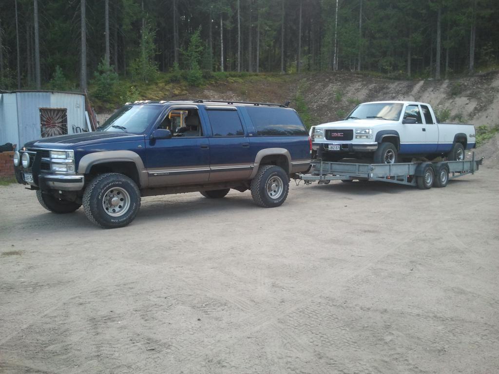 Pari omaa havaintoa 3,5t kärryn vetämisestä: - vetoauton iso omapaino ja pitkä akseliväli on aina plussaa - mitä lyhyempi etäisyys koukusta taka-akseliin (vetoautossa) aina parempi - tömäkkä jousitus, varsinkin taka-akselilla on pop - koukku max. pari senttiä ylempänä kuin kärryn vetopää - trailerin renkaat mallia "isot" eikä sellaset 13" matalakumit. Rengaspainetta reilusti. Kesäksi kesärenkaat ja talveksi oikeat talvirenkaat - kuorman riittävä sidonta eli varsinkin korkeista kierrejousitetuista maastureista myös koppa kiinni ettei huoju - ja sitä aisapainoa... reilusti eli 5-7% kärryn kokonaispainosta! Kuvan vetoautoa on korotettu 4,5", vetokoukku passattu oikealle korkeudelle, K2500 alusta eli suht tömäkät takajouset (900kg kantavuus). Kärryn kyydissä n. 2700kg pick-up pitkällä lavalla. Kärryn lavakoko 220x600,kokonaisleveys 260cm. omapaino 960kg, kantavuus 2540kg. Tuli ongelmitta perässä, 90km/h vetonopeus. Samaisella kärryllä on haettu useita Suburbaneita ja hyvin tulee perässä. |
