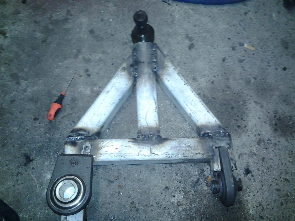 nyt on taas osa hankintoja tehty sen verran että on taas saanu vähä etenemään.. kolmio tukeen hommattu Valmetin nostolaitteen "häränsilmät" runkopuolelle ja kuorma-autosta järeä pallonivel toiseen päähän, oli kuorma-auto purkaamolla hyvä palvelu kun sanoin että tulee offi autoon niin sano että hyvään tarkoitukseen menee niin ei maksa mitään!!