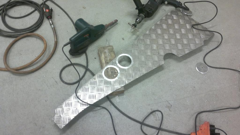 Tänään piti sitten tehdä tuon lokarin kansi. Kuviosahalla pala irti plootusta ja rälläkällä reunojen siivous, vähän paikalleen sovitusta ja etureunan taivutus. Sitten piti tehdä nuo reiät lämppärin ilmanoton ritilöille, vingulla ja kapeanauhahiomakoneella upotus ettei ritilä törrötä tossa turkkialumiinissa. Tommonen siitä sit tuli, ei tartte enää tehdä kun toinen puoli, ja vähän maalata, ja,ja,ja