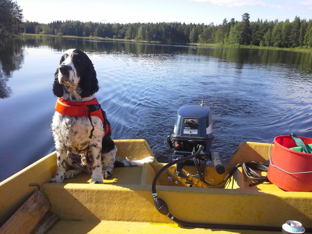 Ei varsinaisesti oma koira mutta hyvin paljon minun mukana pikkukaveri on,,, varsinkin Mökillä kalassa.. IHAN hullu kalan perään.(lintukoira)