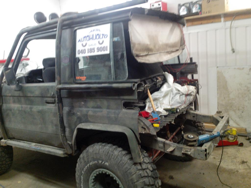RJ70 LyhennysHeitetääs tänne omat ajatukset -89 RJ70 lyhennyksestä. Elikkä olen tullut siihen tulokseen että takana on ihan liikaa akselin ylitystä ja olenkin ajatellut että mitäpä jos nappaisin 20-30cm autosta pois. Homman toteuttaisin siten että auto lyhennettäisiin heti pyöränkaaren takapuolelta. Takalasit aukeat kuten jäätelöautossa eli laseja ei tarvitsisi muokata. Homma sujuisi teoriassa siten että leikkaan korista ja rungosta 20-30cm pois ja hitsailen runkopalkin takapään takaisin yhteen, samoin myös korin. korin ja rungon välisten kiinitysten määrä ei tule muuttumaan. Bensatankkia koitan ensin saada sen verran eteenpäin on vaan mahdollista, tai sitten laitetaan turvatankki auton sisälle. Auto on talvikäyttöautona joten orkkistankki olisi kiva niin bensamittarikin toimii. Kuulostaako tämä hullulta? onko auton lyhennykseen jotain lakipykäliä mikä määrää lyhennyksen määrän ja menettelytavat