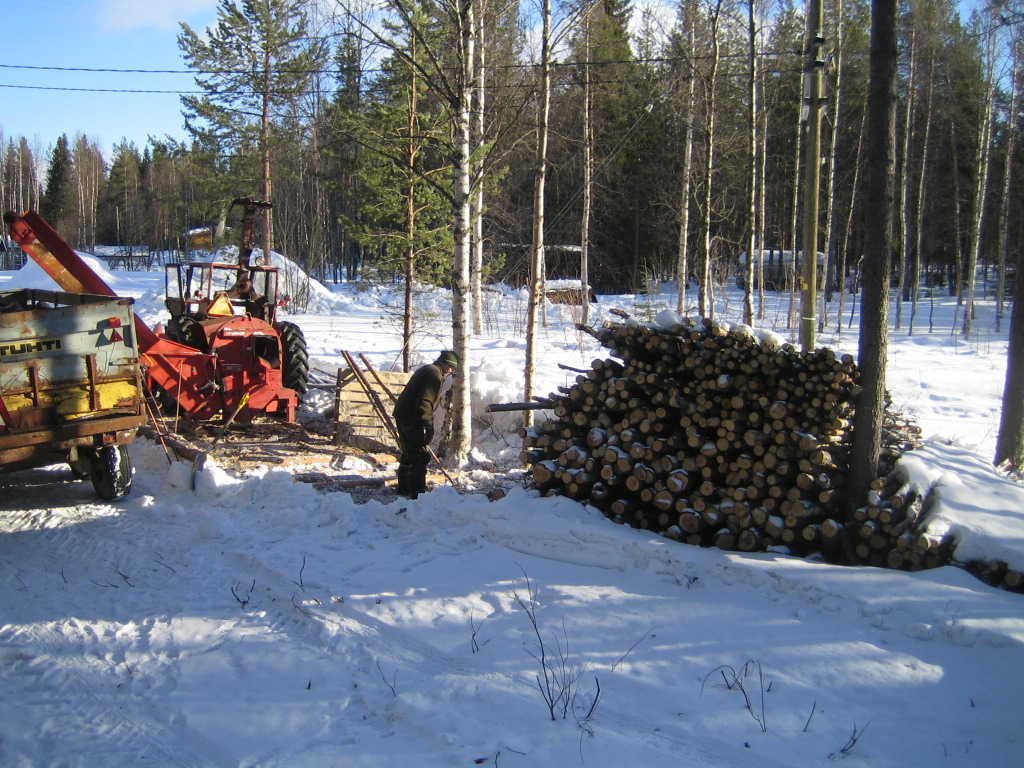 Viime kesänä tuli ostettua osakkuus yhteen kolhoosi klapikoneeseen ja sehän piti käydä hakemassa testiin ja johan alko pino silppuuntumaan. Kone on Tuiko merkkinen rouskuttaja jostakin 80 luvun puolelta. Tuolla koneella ja sopivalla puulla homma meni melko joutusaksi ja kahta rattorin kärryllistä tuolla päivässä helposti teki. Kolmella ukolla homma käytti melko näppärästi, kun yksi syötti puuta koneeseen, toinen tarjosi puuta syöttäjälle ja kolmas repi puita pinosta lähemmäksi ja muutenkin piti pakettia silmällä. Sen verran homma meni joutusaksi että jäljelle jäi vain isoja runkoja jotka pitää moottorisahalla pieniä tässä vähän myöhemmin. Kärryyn tein korokelaidat ja kuormaan mahtu noin 8,5 mottia ja kuormia tuli yhteensä kaheksan. Alkuun tuli rehvasteltua että puita olisi kasassa ollut sata mottia mutta eihän tuota nyt ihan nuin paljon kuitenkaan ollut. Sitten kun nuot vielä pinoaa niin eihän tuosta montaa pinoa tulekkaan. No josko nuilla nyt pari pesällistä kuiten sais lämmitettyä. Mutta pakko sanoa että ihan kivaa harrastelua tuo puun teko kuitenkin on kaiken kaikkeaan. Ukot saa liikettä ja työn tuloksen näkee heti. Niin ja lahjotettiinhan me tuo viiminen kuorma tuolle naapurin isännälle joka sairastelun takia ei itse ole kyennyt puitaan tekemään. Joskus ollaan rauta romua isännältä haettu joten annetaan sitten puita vaihdossa. |