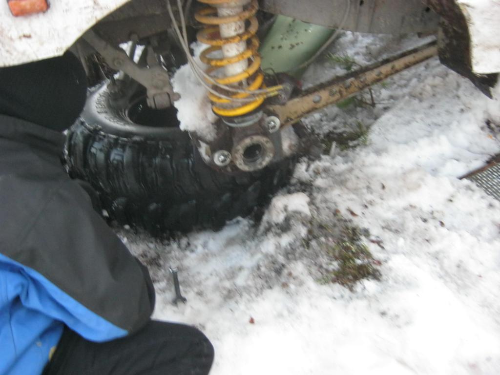 pari tuntia homma meni ku römpsöössä kunnes takaa meni tietysti se lukkoon hitsattu perä paskaksi. hitsaukset piti mutta ne pikkuhampaat meni kappaleiksi,siis halkesivat.nooh,perän vaihto ja uudestaan,kunnes edestä kuului napsaus...sisempi vetari kuskinpuolelta poikki.varaosiahan oli onneksi mukana joten auto tunkin nokkaan ja kuskinpuoli purkuun,helppo homma mutta...milläs helvetillä saadaan se vetarin tumppi sieltä pois??? ei muuta ku vänkärin puolikin auki että saataisiin lyötyä se sieltä kautta pihalle,vaan eipäs lähdekkään,10mm jenkatangosta kiven päällä moukaroitiin specialkustomtyökalu mikä mahtui ristitapin ohi mutta vetarin tumppi ei liikkunut mihinkään,perkele!!tässä vaiheessa ilta alkoi jo hämärtää ja väsy ja vitutus oli noususuhdanteista...pikainen tilannekatsaus ja homma bueno,pelastuspartio hälytettiin matkaan ja sakilla auto kasaan,kuskinpuolelta jätettiin pois vetari ja murros ku ei sitä pätkää pois saatu.loppu hyvin kaikki hyvin ja summa summarum=akselit täytyy ruveta päivittämään vaikka en siihen mielellään oisi halunnut ryhtyä,noita akseleita en rupea vahvistamaan koska samalla rahalla saa porttaalit tai esim. hj61 akselit...