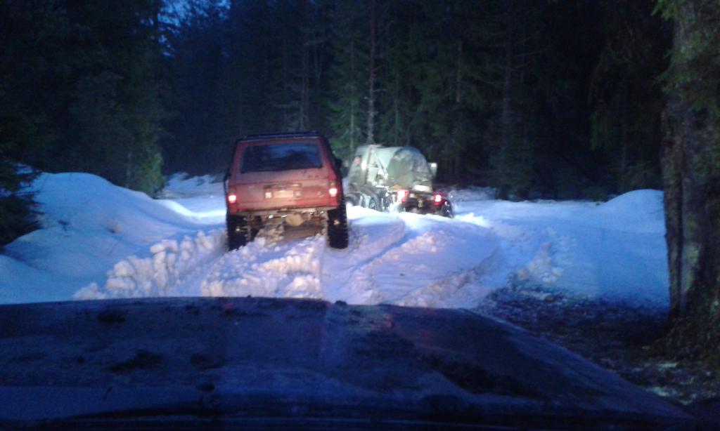 "Klo 3 aikaan leirissä. Ajettiin 2013 mudventures-reittiä aamusta ja Paalijärven ylitys oli pilattu uudella sillalla. Nyt tempokeskuksen tietämillä. Kukaan ei ole tehnyt remonttia eli vehkeet on kestäneet hyvin. " "Edellinen lähetys vähän kesti kun ei ollut kenttää. Nyt mutasafarireitillä eksyksissä ja leiri pystyssä. " "Lunta on paikoitellen puoli metriä... "