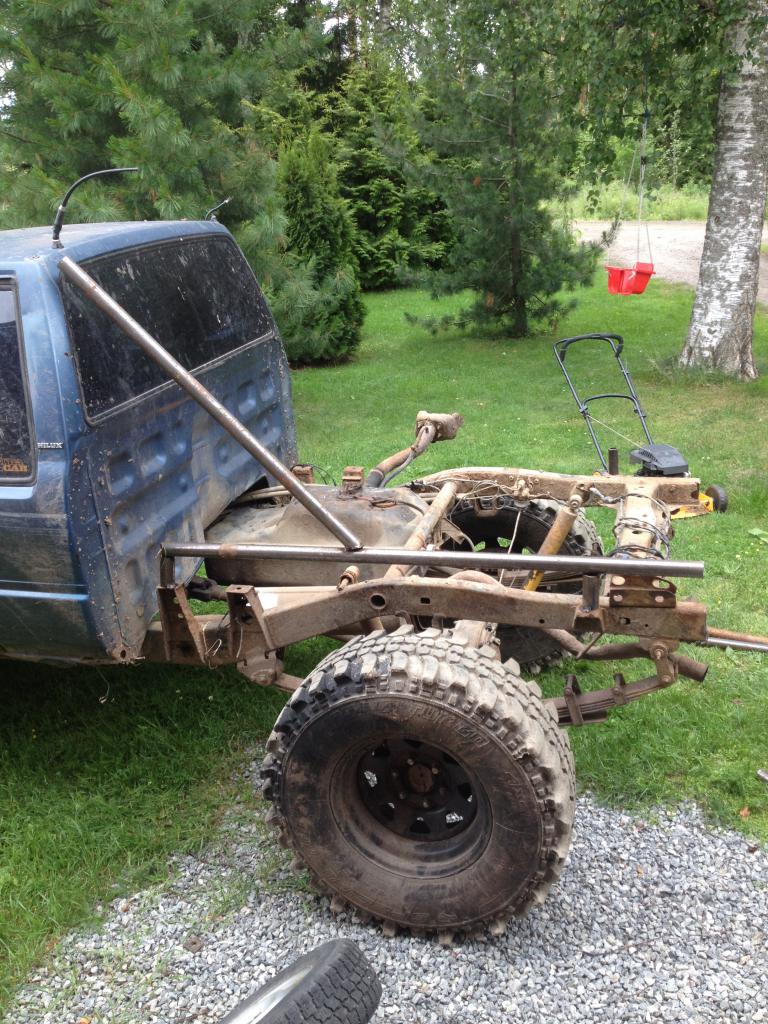 Hilux ln65, Kuka korotti hiluxini?Tulipa hommattua kaverin (nbf) kanssa hiluxi josta tarkoitus rakennella laite jolla pääsee vähän maantietäkin pidemmälle. Auton meille tullessa oli alla 245/75R16 loppuun ajetut mud terrainit, heti kun lähdettiin testaamaan maasto-omituisuuksia niin ensimmäiseen ojaan kiinni ![]() Eli siis rengaskaupoille ensimmäisenä, Uimaharjun? läheltä löytyikin 285/75R16 (tuumissa vähän vajaa 33") käytetyt insa turbot jotka ovat osoittautuneet erittäin hyväksi hankinnaksi. Seuraavana olikin vinssin hankinta, joksi valikoitui powermaxin 9,5 luonnollisesti sinkki ei ollut vaihtoehto Vinssi saatiinkin yllättävän syvälle ilman syylärin siirtoa Ja koska Ilomantsin safari painoi päällensä ja pelottelivat että grande final siellä on hirveän ojan ylitys jossa vettä kolmatta metriä niin pitihän se snorkkeli viritellä Summa summarum, Ojakin kierrettiin yhtiökumppanin painostuksesta huolimatta To do: -Flat bed > done -Palkkihelmat ja Jonkinlaiset kaaret korin ympärille > done -Etukardaanin ristikoiden vaihto -Lehtijousien helojen vaihto> done -Etulukon hankinta ja asennus -Takalukkoa kokeillaan soveltamalla > done-Hitsausta katsastukseen > done -Jarrupaineen säätimen korjaus (jos joltain löytyy ehjää niin saapi tarjotella vaikka privalla) > done -Takavalojen asennus ja kytkentä > done -Välitetty jakolaatikko -Takaiskareiden muutos -Takajarrujen puhdistus ja vetoakselin stefojen vaihto > done To be continue