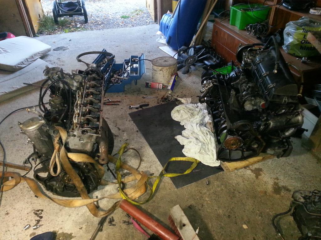 Pohjan ollessa auki, näki vähän koneen sisään. Öljypumpunketjunkiristinkiskohan se on kulunu ja sylinterin hoonaukset kadonnut, tai ainakin näytti siltä, todella kiiltävät putket. Tiedä sitten miltä niitten sylintereiden pitäis näyttää.. Olisko vapaaehtoisia hitsaamaan tuon alumiiniöljypohjan?