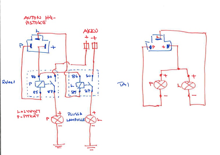 Mites jos haluaisi muuttaa pitkät ja lyhyet yhtäaikaa palaviksi? mulla h4 vaihtuu siis kahteen erilliseen umpioon. Lyhysiin plussa orkkisliittimestä ja miinus maihin? Pitkät releyttää yllämainitun kuvan mukaan? Toimisiko se noin vai nouseekohan savut jostain..