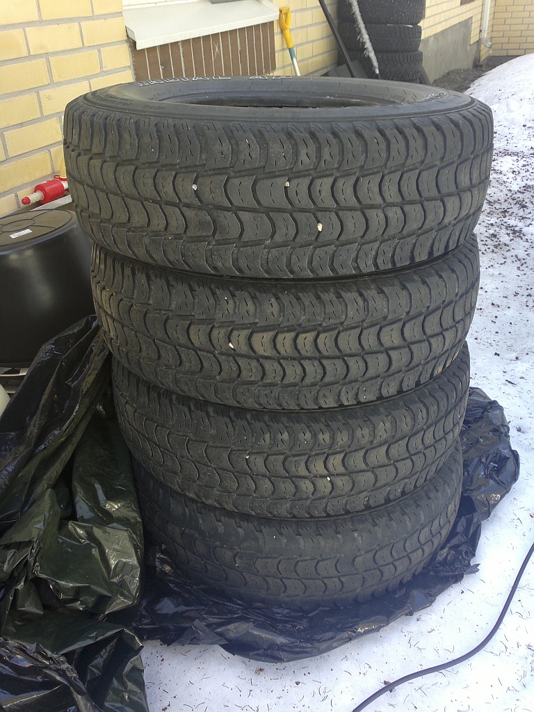 Pintaa 5-6mm. Kaksi vielä hyvää, joissa tasaisesti pintaa. Toiset kaksi mahineet jonkin verran kulutuspinnan välistä, ilmat pysyi sisässä. Varma kaveri laittaa sisuskumit. Näistä toinen rengas kulunut ulkoreunastaan.