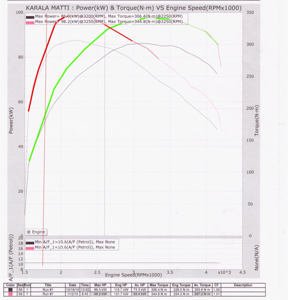 Rengas tehojen mittauksen perusteella tuli n.16kw22hv lisää ja arvioi että vääntö olisi 400-hujakoilla.