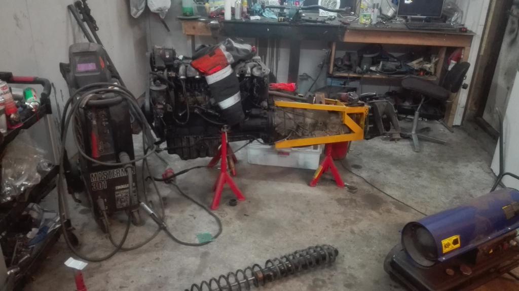 Tuossa lattialla näkyy mikä ois meininki. Raskaankaluston 14"iskulla olevasta neste iskarista pitäis värkätä vähän löysempi lisäsäiliöllinen kaasucoilooveri. Taakse pitäis saada paljo reboundivaimennusta jos tulee joskus otettua ilmalentoa nii ei lennä nenälleen