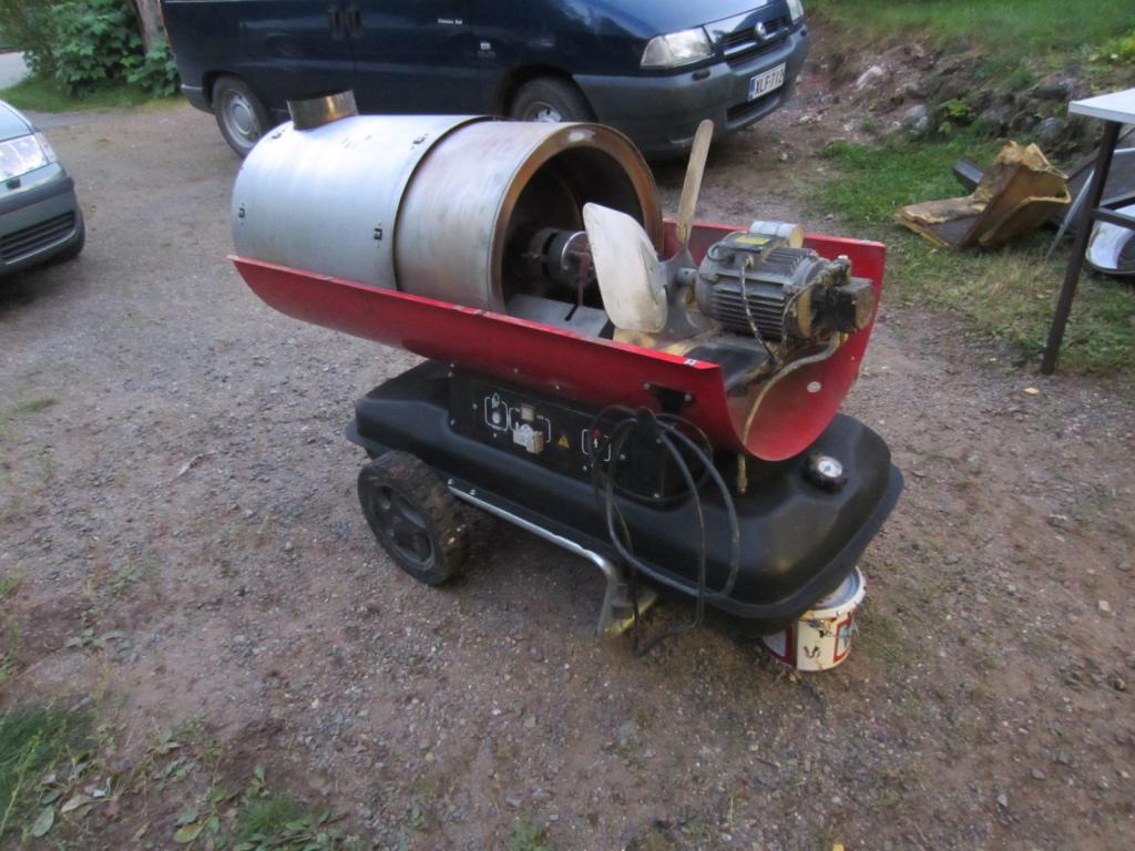 Meinasi heittää rautaromukasaan, mutta pelastin pois. Pitihän se heti preparoida ja katsoa minkä takia kone kiukuttelee. Ensinnäkin ne kumiset polttoaineletkut piti lyhentää joka nipan juuresta, koska kaikki liitokset olivat halkeilleet ja päästivät ylimääräistä ilmaa polttoainejärjestelmään. Muutaman lämmityskerran jälkeen kone alkoi taas temppuilemaan. Tällä kertaa syynä oli lamellipumpun kiinni juuttuneet lamellit. Koska osa lamelleista oli jo niin haperoa tavaraa, niin ilmapumppu ei enää jaksanut pumpata tarpeeksi ilmaa ja koko pumppu olisi pitänyt uusia. Tässä lämmittimessä on poltinpää kuten öljypolttimessa. Suutin on samanlainen ja myös polttoaineen sytytysjärjestelmä. Sama akseli pyörittää ilmapuhallinta ja lamellipumppua. Tuo lamellityyppinen ilmapumppu painaa paineilmaa suutinpäähän, josta toinen letku vetää alipaineella polttoainetta tankista. Samankaltainen toimintaperiaate, kuin esim. maaliruiskussa. Omaan lämmittimeeni rakensin normaalin paineilmalaitteistoista tutun virtaussäätimen, vedenerottajalla varustettuna. Nyt on helppo säätää koneen tehoja, kun vain vähän hienosäätää paineilman virtauksen määrää. Laite ei pölläyttele, eikä kärytä. Vielä pari varoituksen sanaa: Uusi lamellipumppu kannattaa ostaa, varsinkin jos lämmittelee toiselta vuokrattuja työtiloja. Siinä jää palovakuutuksista korvaukset saamatta, jos vaikka kytemään jäänyt rälläkän- tai hitsauskipinä sytyttää yöllä hallin palamaan. Vakuutusyhtiön tarkastaja kuitenkin päättää, että palo on alkanut viallisesta, itse laittomasti korjatusta lämmittimestä, joten eipä maksella korvauksia. Pahimmassa tapauksessa saattaa saada tuhopoltosta syytteet niskaan...