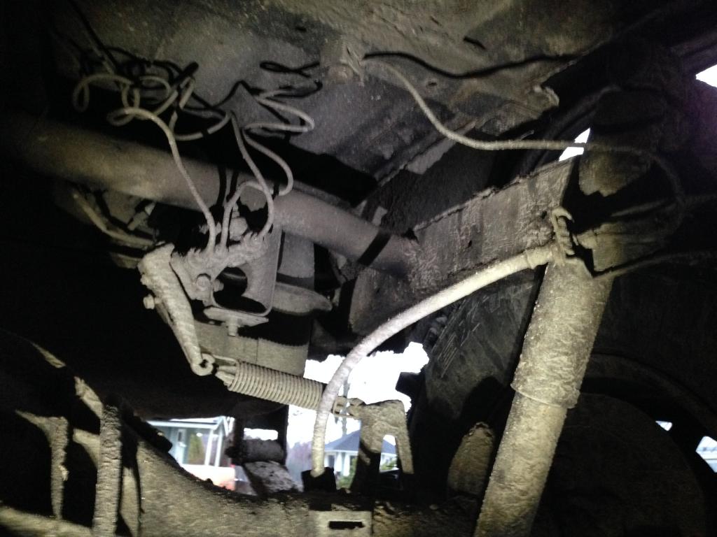 Tässä kuva jarrupaineensäätimestä. Säädin on alkuperäisessä paikassa, jarruputket on kiinnitetty koriin.
