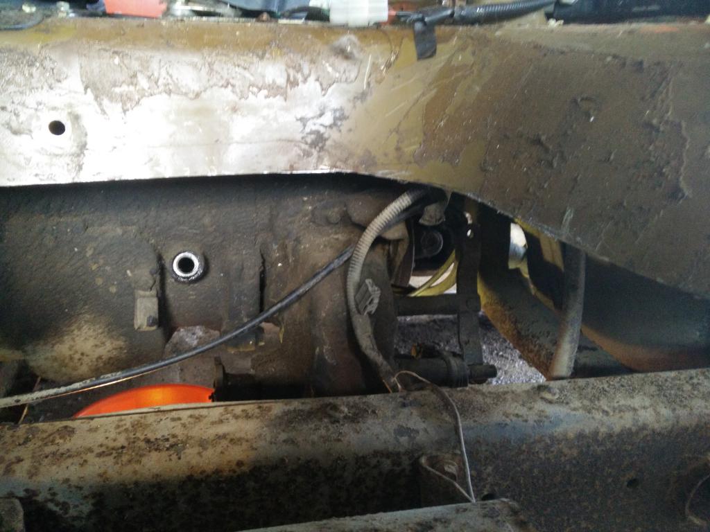 Leikkelyitten jälkeen alkoi kori leviämään pitkin tallia niin piti laittaa muutama putki pitämään koria läjässä. Mitoista kiitos HannuN:lle ja Häänrikille niiden mukaan laitettiin takaosan jäykkärit kiinni. Samalla kun oli kuskin lattia pois niin huomattiin että pitäisikö se herkistellä PTO:kin toimimaan ja ohimennen voisi vaihtaa laatikon öljyt kun näytti tuo täyttö proppu tulevan sopivasti esille. Pto:n vaijeria epäiltiin aluksi mutta se kun oli riivitty irti ja lattiasta kahvakin oli pöydällä tultiin siihen tulokseen että siirto on vipu jumissa joten ei muuta kuin koko murikka pois. Ruuvipenkkiä, vasaraa ja crc:tä sopivassa suhteessa niin alkoi vipuliikkumaan kuin uutena.