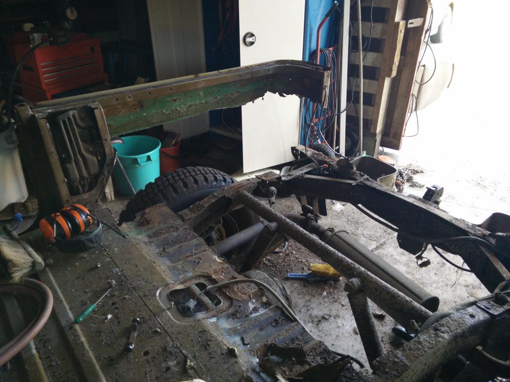 Multitoolia ja puukkosahaa tuli sitten käytettyä kohtuudella. Takakylkiä ei uskaltanut vielä kaikkia leikkoa pois kun ei ole vielä tietoa että minkä kokoiset palaset tulee naapurikylän peltisepältä. Kuskinpuolen lattia leikottiin korinkiinnikkeitä myöten pois kun oli aikaisemmin paikattu vain laittamalla uutta peltiä ruosteen päälle. Samalla lähti sitten melkolailla koko helmakin lattian mukana. Helman tilalle olisi tarkoitus laittaa 120*60 putkipalkki jolloin korin kiinnikkeet saa hitsattua siihen kiinni ja pian aikaa kestää siltä kohtaa hiukkasen nostaakin.Tuon kokoisella palkilla helmalinja nousee 20-40 milliä ylöspäin mutta eipä tätä olla entisöimässä ja plussana saa hieman kestävyyttä ruostetta vastaan.