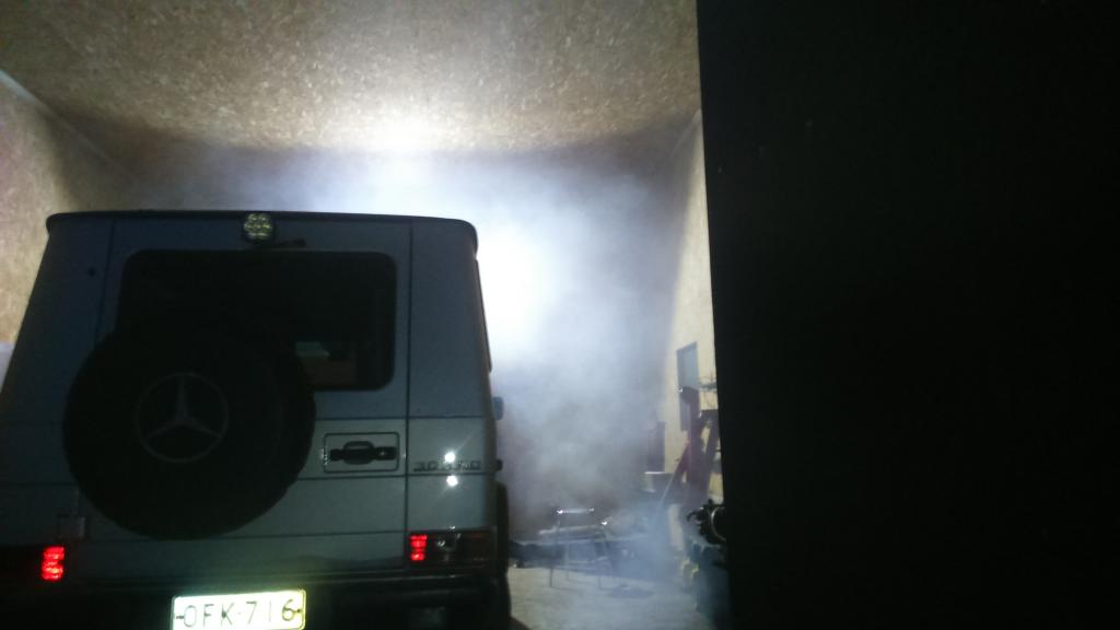Vaihdoin Geehen venttiilinvarren kumit, mutta ei mitään vaikutusta savutukseen. Ei kai tässä auta kuin pistää kone palasiksi. Otin tallista kuvan, kun auto oli käynyt jonkin aikaa tyhjäkäyntiä siellä.