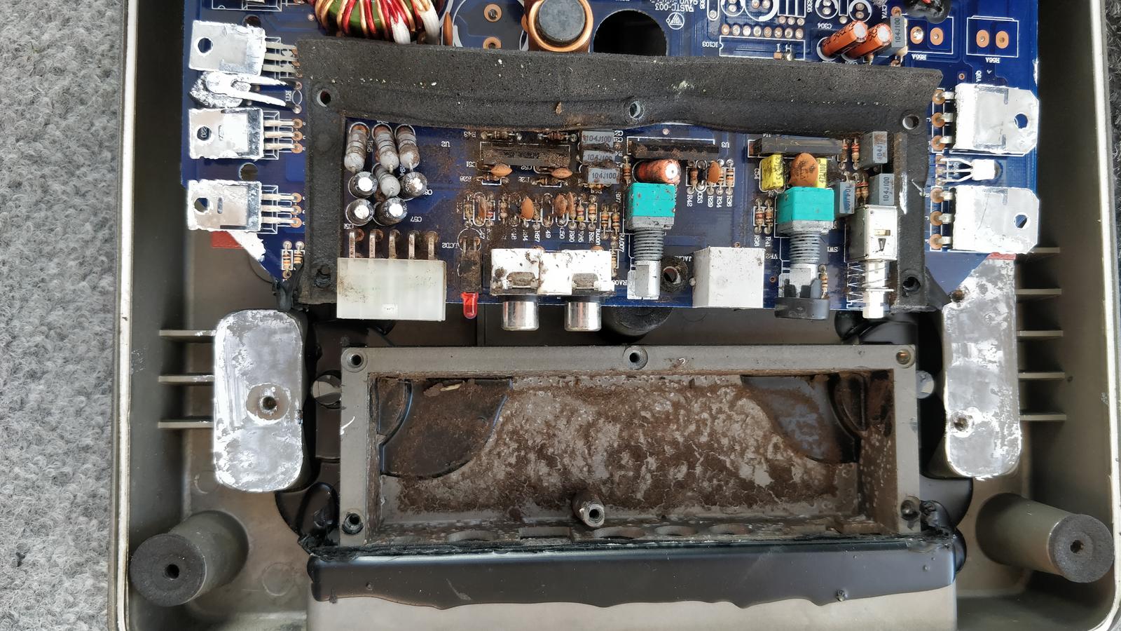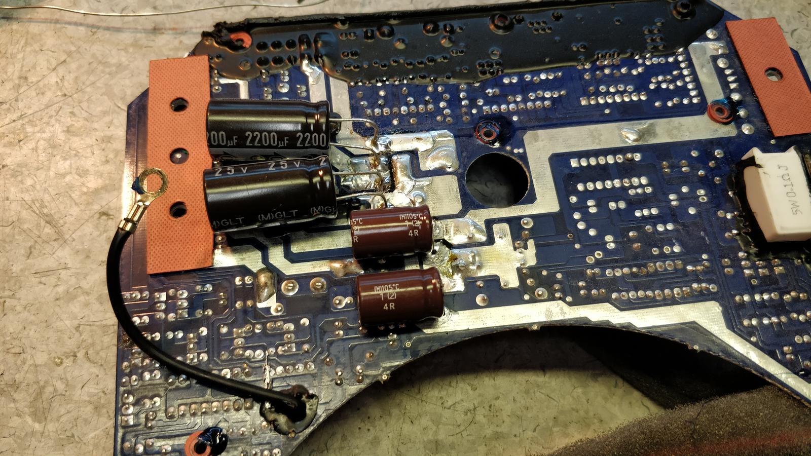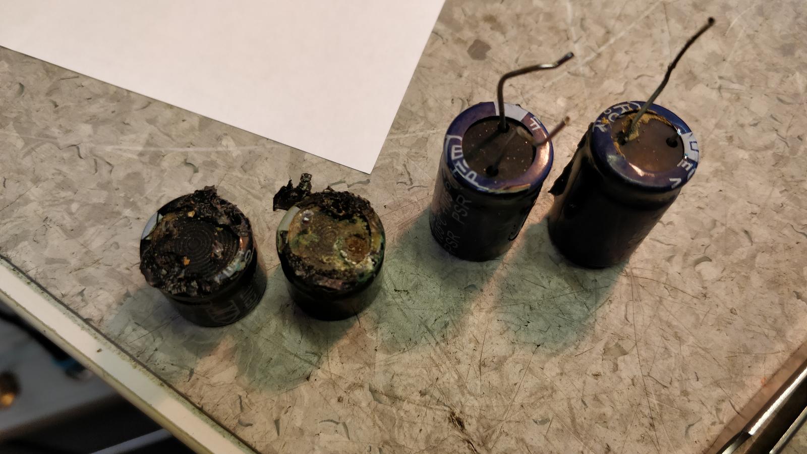 Perät ja jakolaatikko sai uuden öljyn. Jakolaatikon tyhjennyspropun magneettiin oli tarttunut jännää hippua. Mistähän moinen tulee? Taitaa olla jakolaatiokon 10V huollon aika... Subbari hörppäsi liittimien rei'istä vähän turvelietettä välisäiliöön Availin vain putsailua varten, mutta huomasin, että yksi konkka pullotti ja toinen oli silminnähden laskenut alleen. Irroittelun jälkeen lopputulos oli selvä, vaihtokuntoisia kaikki. Jemmassa ei ollut 36V konkkia, mutta löytyi 25V konkat muuten samoilla arvoilla. Tarkistin vielä ennen kasaamista, että konkkien yli menevän jännitteen. Noi 1000u konkat on ilmeisesti jotku häiriönpoistokonkat tms, kun ne on kaiuttimen - lähdössä. 2200u konkat on taas sisääntulossa, johon tulee akulta jännite, eli nuo 25V konkat kelpaa mainiosti tähän.