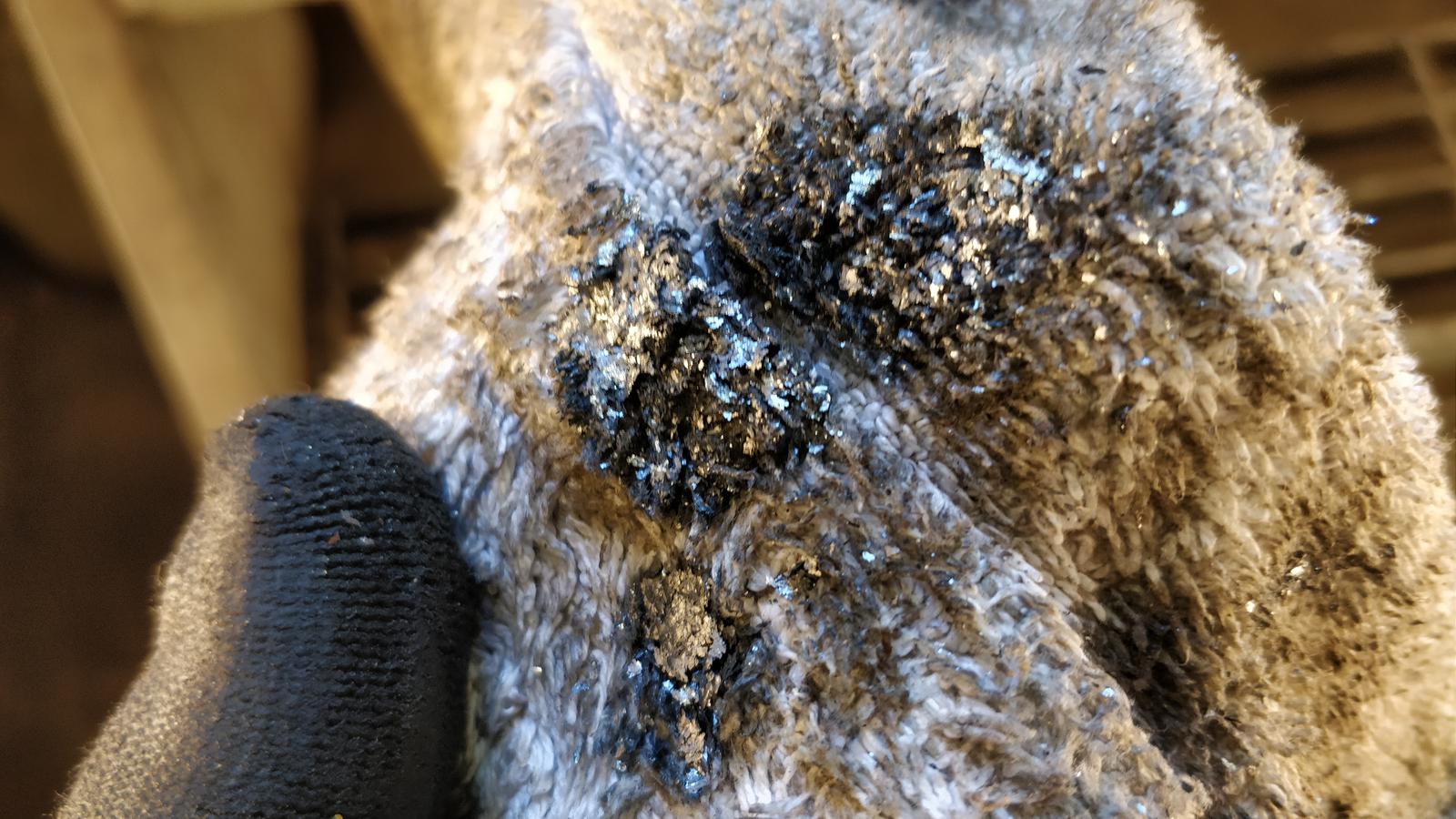 Tämänkin voi tehdä kahdella tapaa; kunnolla tai nopeasti. Laiskotti sen verran, etten lähtenyt purkamaan kojelautaa ja kaikkea tingeltangelia, että valitsin jälkimmäisen. 38mm reikäsahalla kennon yläpuolelle reikä. Puhaltimen moottorin saa pienellä ähertämisellä pois ihan näin. Omaa hommaa voi myös helpottaa veistämällä tai hiomalla ilmanottokaukalon pohjassa olevaa lippaa muutaman millin (tässä kuvassa hieman näkyy kuvan yläkulmassa ennen hiomista), jonka jälkeen puhallinta ei tarvitse punkea ollenkaan. Kurkistus reiästä kertoo just sitä mitä osasin odottaa. Imurilla ensin mitä näkyvissä oli ja sitten paineilmaa puhallellen kaikista suunnista kunttaa liikkeelle. Puhaltelin myös vedenpoistoputkista sekä lämppärin ilmanotosta. Noissa koteloissa on kolosia, joihin kompostoituu vuosien aikana paljon tavaraa. Imurin letkussa ropisi joka suhauksella. Tällä operaatiolla sai nyt varmasti ostettua pari vuotta lisäaikaa ennen kuin on joku muukin syy ottaa kojelautaa irti ja sitten pitää kyllä vielä putsata tuo kertaalleen avaamalla tuo kennon kotelo. Reiän siistin purseista ja tulppasin 3D-tulosteella. Puhaltimen moottorin menin avaamaan uteliaisuudesta. Hiilistä ja kollektorin kulumisesta syntynyttä nöyhtää. Kollektori on aika pahasti kulunut ja hiiletkin finaalissa. Ei tälle nyt tällä kertaa muuta voinut, kuin putsata ja lyödä takaisin kasaan. Pitää varmaan laittaa ostoslistalle uutta puhaltimen moottoria...