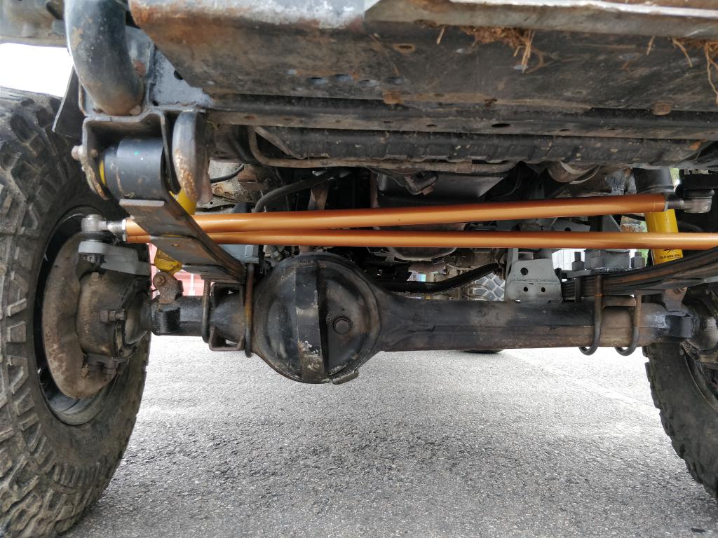 Samassa rytäkässä rakentelin taakse sellaisen traction barin. Katsotaan miten hitsit kestää ja kuinka putki vääntyy, mutta sillain onnistunut on että tuki on keskelle eikä rajoita joustoja. Etupäässä on riipukkeella kiinnitys ja siellä on uniball nivel. Loput kolme liitosta on toteutettu putken ja hiluxin lehtijousten puslien avulla. Kuvissa vielä pultit auki että ihan tollaiseksi eivät jääneet.