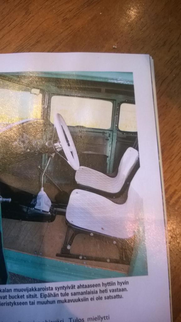 Tänään säädin kengät iholle ja ilmasin jarrut. Ensin meinas vähän vastustaa mutta rupes pelaamaan kun käytin poljinsetin osissa ja säädin pääsylkkyjen tankoja. Nyt pitäs pelata. Jarruista ei pitäs puuttua enää kuin käsijarruvaijerin paikoilleen laitto. Illasta kävin ruuvailemassa johtojen suojaputket kiinni koriin ja katkoin oikean mittaseks. Nyt vois korvata nuo väliaikaiset johdotukset uusilla. Postikin toi vajaa 400m erivärisiä piuhoja ja yks ilta tuli pultattua päävirrat, startin pääkaapelit ja sulakerasiakin paikoilleen. Tässä joutuu kohta sähköhommiin... Uusimmassa V8:ssa tai Ameriikan raudassa oli rodi juttu josta bongasin penkit. Niistä heräs ajatus että mitenhän nuo mun 'bomber' penkit sais samantyylisiks... Eli pintamateriaali ja ehkä parin millin pehmuste alla. Onnistuiskohan nuo vain liimata paikoilleen? Pittää yrittää ettiä netistä jotain inhoa aiheesta... |