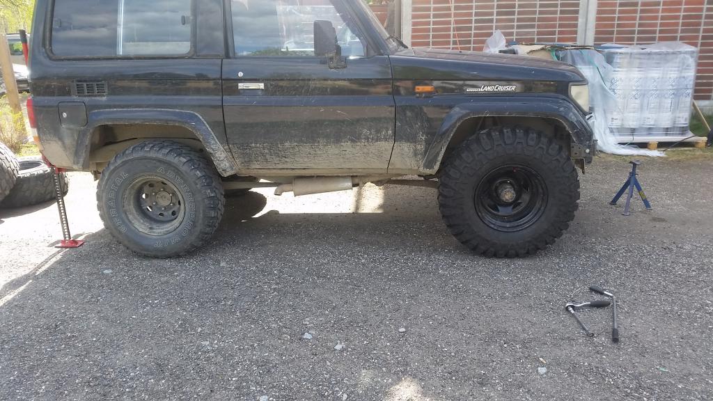 Ei riitä, tuo on 31" kokoinen kumi, korkeus 775 mm. Pitäis olla tuumaa korkeempi. Ei saa kierrejousi-LäJään rehtisti 35" kumeja. Jotain pitää kattoo kieroon ja ristiin ja rastiin ja laskee väärin että saahaan onnistumaan.
