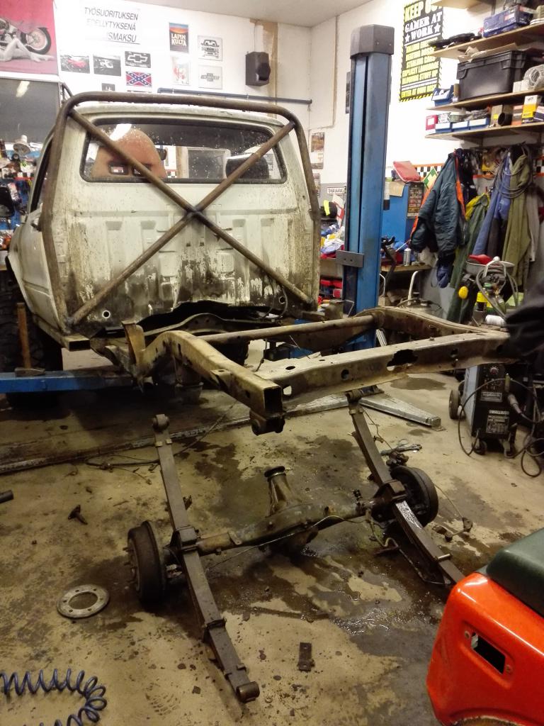 Tähän on jo jonku verra keretty tekemään jotakin mm. Mädät hitsattu korista, helmapalkit, 50mm kori korotus, etu puskuri, kaaret avarrettu että mahtuu isommat pyörät pyörimää ja pää kaari taivutettu.
