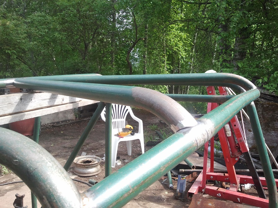 Seuraavaksi oli vuorossa kaarien nosto pois auton päältä lähinnä saumojen viimeistelyä ja maalausta varten. Kallellaan ollut puu + tikkaat tukena + ketjunosturi hoitivat tämän homman