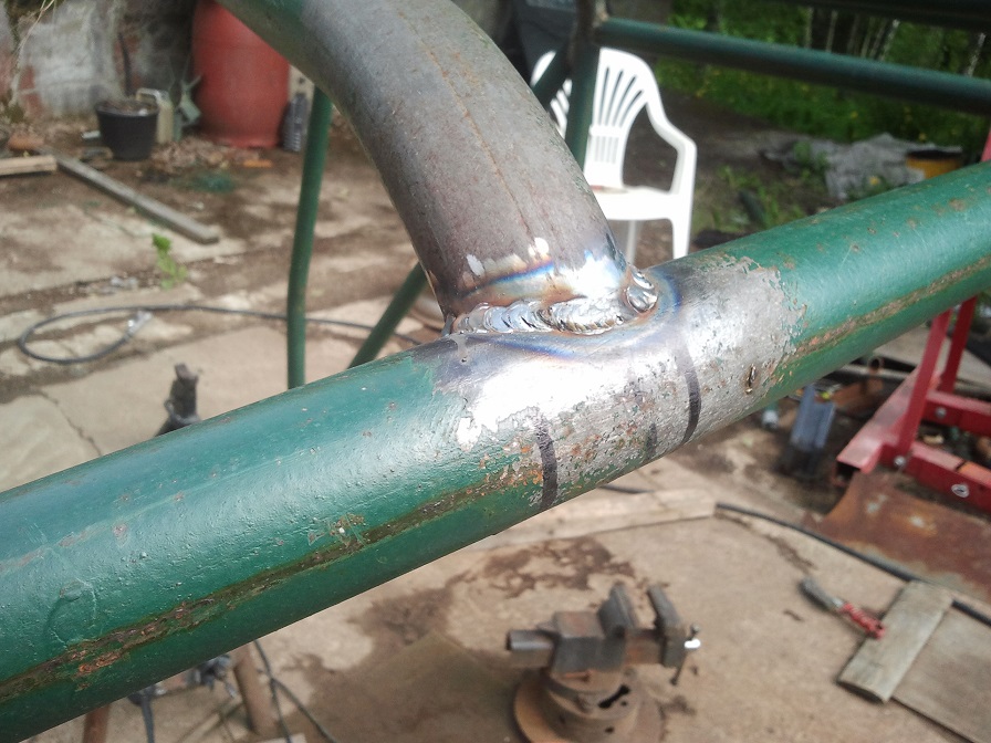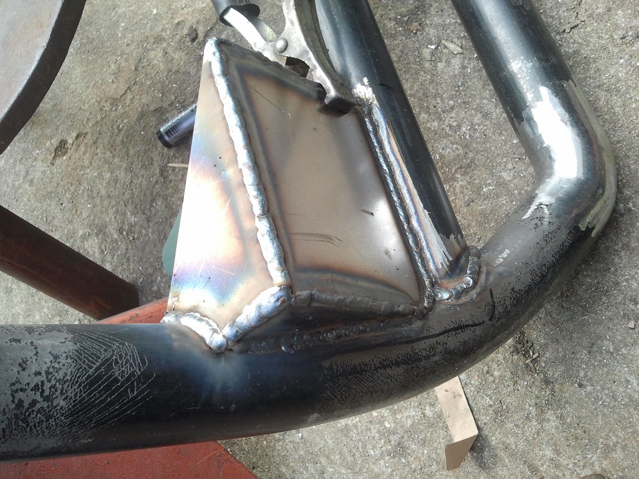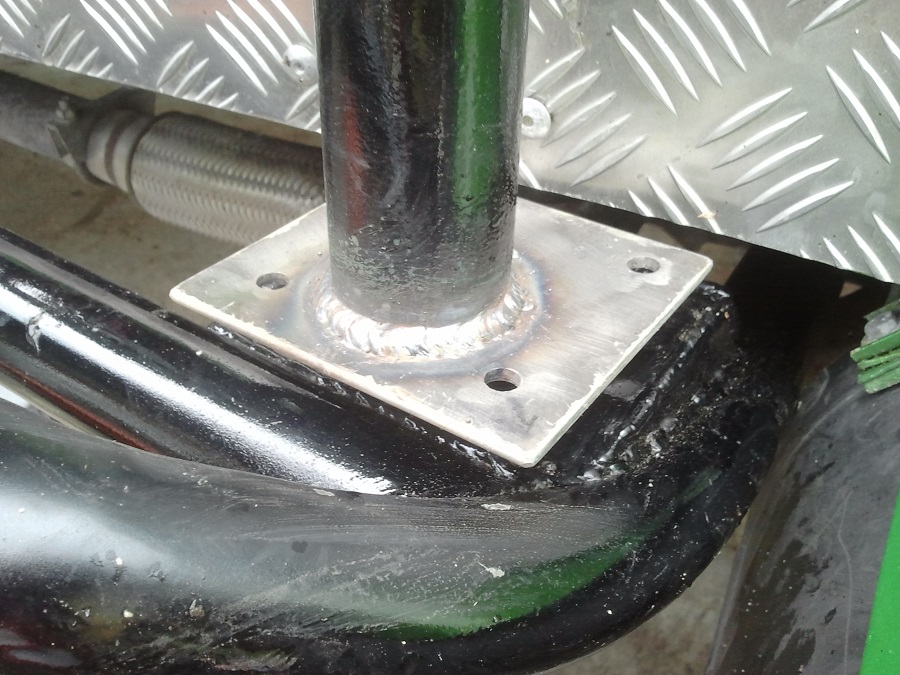 Elikkäs helmaputkien etuosaan tuli alusta turvakaarelle. Tämä kuva yläpuolelta Alapuolelta kuva Ja koska kaaret ovat kiinni sekä korissa, että rungossa, laitettiin kaaren kiinnityksen väliin n.1cm paksua kumia estämään mahdolliset tärinät. En tiedä olisko ollut tarpeellinen, mutta muutaman vuoden ajelujen perusteella toiminut ainakin hyvin. Kuminhan voi aina ottaa poiskin jos haluaa... Lappu hitsattuna kaareen |