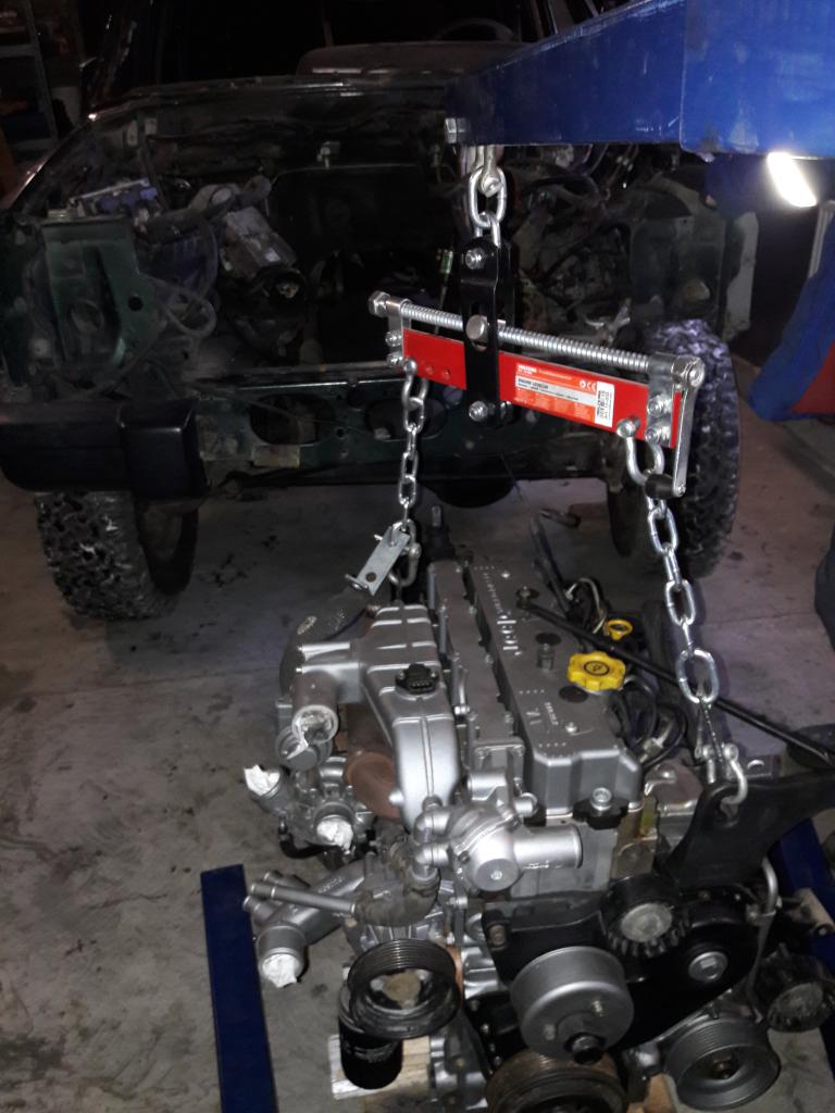 engine went back into its place with tranny in one piece. i was lazy enough not to remove the brackets to make it quicker (in my head) but it wasn't the best idea. remove the mounting brackets from chasis saves time and nervous.