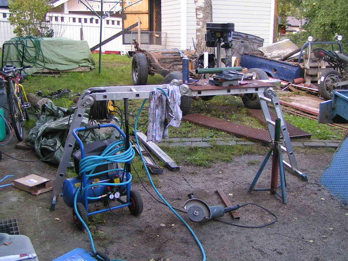Ja tommosen niistä sitten tuli, pintakäsittely osasto ei kyllä saa maalauksesta kunniamainintaa, mutta pitänee ruosteen loitolla. Toisessa kuvassa köyhän miehen konepaja.