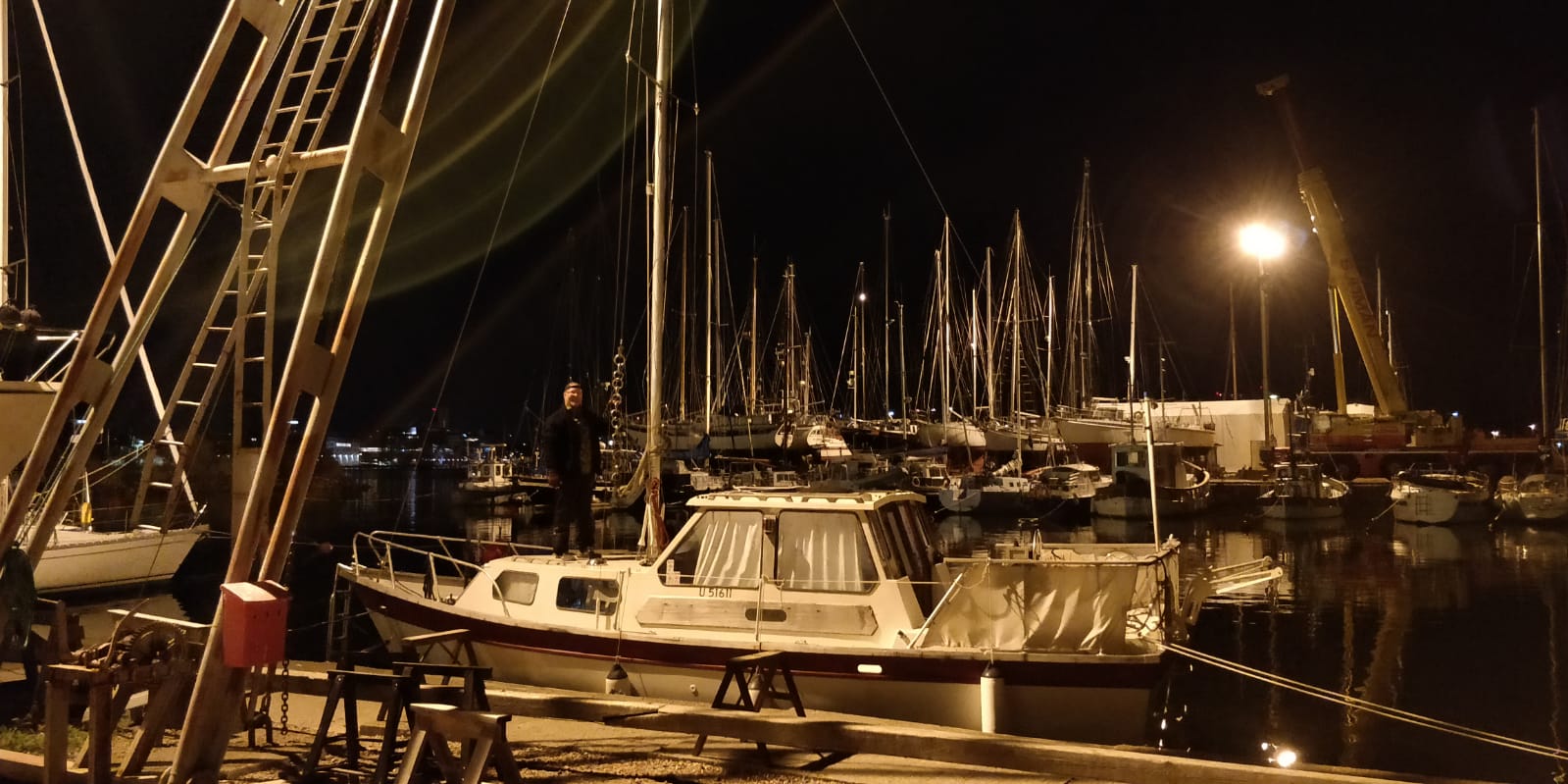 Vene taas nostettu merestä ja telakoitu, lavetti toi pihaan tänä aamuna.