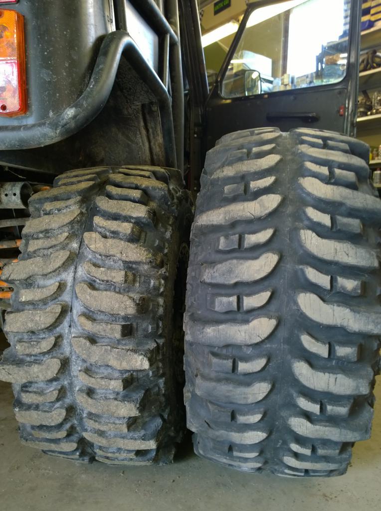 Rullailtiin vararengas auton viereen ja tavattiin renkaiden kylkitekstejä. Siinä sitä nyt sitten on vierekkäin kaksi identtistä rengasta. Sama valmistaja, sama malli, sama korkeus, sama leveys ja sama vannekoko! Kun nuo alla olevat tuntui olemaan pari tuumaa matalammat ja ainakin tuuman kapeammat, niin piti oikein alkaa tulkilla mittaamaan että ajellaanko tosiaan pikkupyöräisellä autolla. Eipä aivan - näyttäis olevan 33,2" vaikka kyljessä kovasti isompi teksti seisookin.