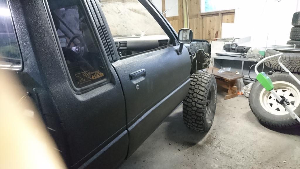 Tänään taas kerkes hetken mylläämään tojon kimpussa. Tarvii välillä nyppiä tota pahaa volkkaria leimaus kuntoon, mut ny ois valot ja lokarit paikassaan ja lavarauta. Samalla pistelin nua sidontalenkit. Ny ei si kai muuta enää ku roiskeläpät tars nakerrella ja pikkasen lisä tukee lokareille. Sit viä dieselin täyttöputki, ku vanha on sen näkönen, et joku ois reenannu haulikko ammuntaa