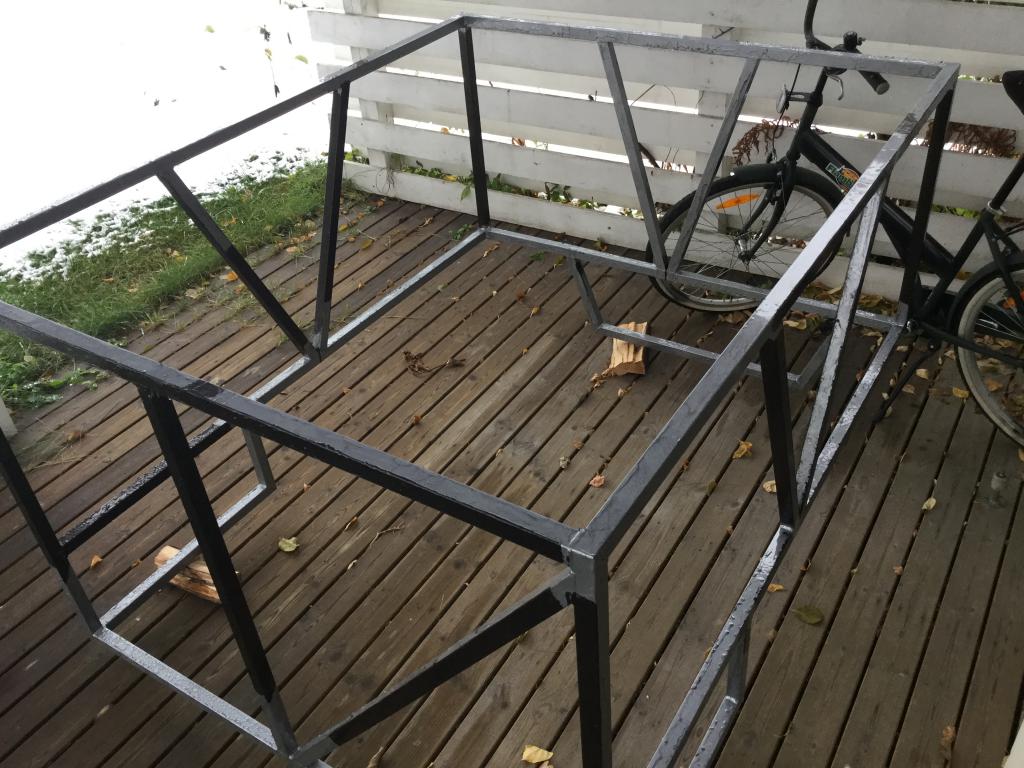 Lavalle tulee ehkä kyytiin tuo kuvan kehikko, sisämitat 1330x1660x1000. Tuon sisään voisi tavarat mahduttaa ja vuorata vaikka vanerilla tai pellillä. Siitä saisi tietty myös viriteltyä vaikkapa nukkumamestan matkaajille.