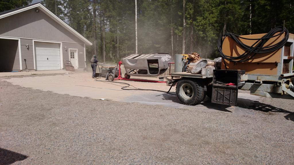 Paljon tuli viime talven aikana hitsattua koria. Ja alkukesästä se puhallettiin. Nyt kori on epoksissa. Irtoosat on vielä maalattava, niistä löyty vielä puhalluksessa parsittavaa. Kauhea polte olisi päästä sovittamaan koria rungolle. Niin korin ja rungon väliin sovitin Ramin polyuretaani kumit. Alunperin ei ollut kummeja ollenkaan. Koitin modata kiinnikkeitä niin ettei kori nouse kuin 15mm. Pakko malttaa ja kuitenkin koittaa kitata katto ja maalata pohja pintamaaliin pyörittäjässä. Kuvia myös ovien uusista lukoista ja ovien sovituksesta. Yksi kuva myös sivulasien kehyksissä. Hiukan panssariajokki henkeä joku ruoja on tosiaan pillittänyt lasin aukon pyöristykset pois.