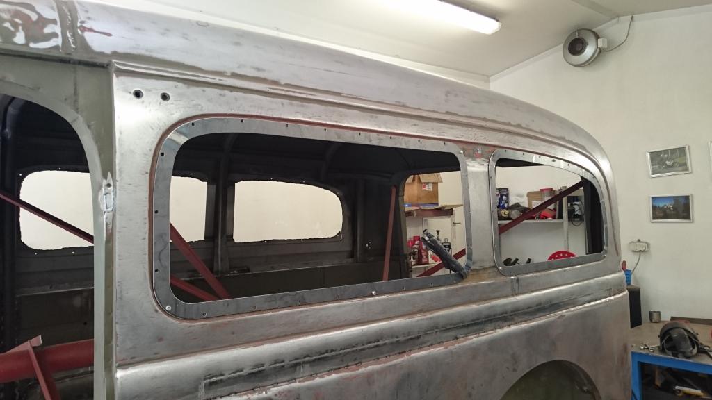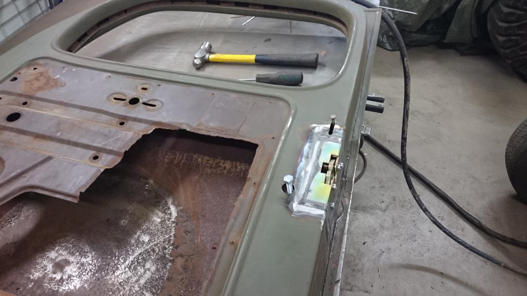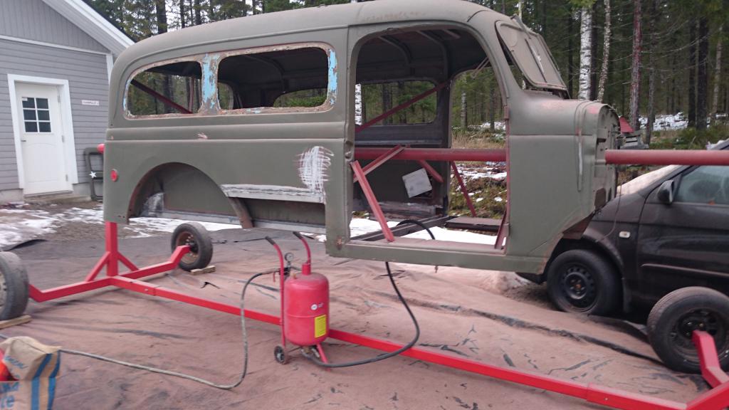 Paljon tuli viime talven aikana hitsattua koria. Ja alkukesästä se puhallettiin. Nyt kori on epoksissa. Irtoosat on vielä maalattava, niistä löyty vielä puhalluksessa parsittavaa. Kauhea polte olisi päästä sovittamaan koria rungolle. Niin korin ja rungon väliin sovitin Ramin polyuretaani kumit. Alunperin ei ollut kummeja ollenkaan. Koitin modata kiinnikkeitä niin ettei kori nouse kuin 15mm. Pakko malttaa ja kuitenkin koittaa kitata katto ja maalata pohja pintamaaliin pyörittäjässä. Kuvia myös ovien uusista lukoista ja ovien sovituksesta. Yksi kuva myös sivulasien kehyksissä. Hiukan panssariajokki henkeä joku ruoja on tosiaan pillittänyt lasin aukon pyöristykset pois.