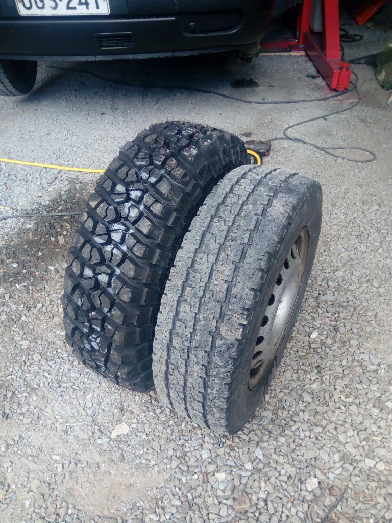 Itellä oli n. 50mm korotettu lyhyt 102hp T4 syncro ja renkaina 235/60-17 8" leveillä vanteilla. ET vanteissa muistaakseni 35. Takana uudet HD-jouset. Edessä mahtu pyörimään, takaa joutu hieman puskuria muotoilemaan. Takaperän alla 30cm maavara, oli mukava ajella kaivosteitä.