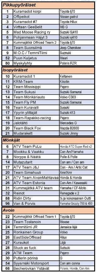 | Offivarusteen Lakeuden Kutsu III 4-6.1.2013 (mönkkäri) Huom harrasteluokka kisassa | joker | Tapahtumat | 12 | 08.01.2013 17:05 |