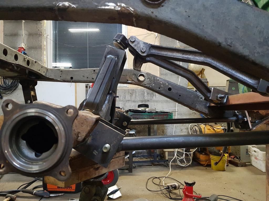 aikalailla valmista tän osalta, iskareita sovittelin eripaikkoihin ja vein lähemmäs murikkaa kyllä sieltä jotakin senttejä sai lisää mutta tyydyin ny tähän ratkasuun. toisaalta sellanen tuli huomattua että jos iskarit olis nyt pidemmät (liikerata suurempi) akseli liikkuisi vielä enemmän eteen päin (auton alle) maxsimi ulos joustossa. ja kardaanin pituus ei riittäisi menis jo niin sisään että joutuis lyhentään. se taas johtuu siitä et alatukivarret lyhyet ja säde minkä akseli tekee on ns jyrkkä/suuri. pidemmillä varsilla säde olis loivempi ja akseli ei liikkuis niin paljon eteenpäin. tarkotuksella muutoskatsastukseen asti orggis rangen tikut jos katsuri haluaa jotain mittoja. pidempien iskareiden mukana tehdään sitte pidemmät alavarret.