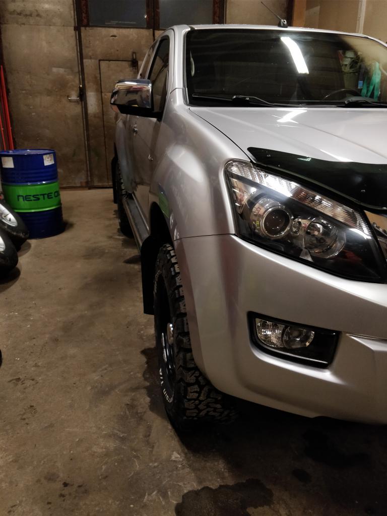 Auto palasi viikkositten maalarilta jossa tehtiin uudelleen autokauppiaan fiksarin tekemät kivenisku ruoste korjaukset eli maalattiin helmat ja lava luukun kera uudelleen. Samalla kun taka luukun kaikki merkit poistuivat niin tilalle tuli pelkkä d-max merkki ja sekin punaisena kuten keulan isuzu teksti. Lava muovin reunojen alle laitoin kiveniskuteipit ja kuraläpistä tein REILUSTI isommat "kuraläppä" kumista. Kuraläpät vaihtuu viellä johonkin kuorma-auton ei kumisiin läppiin koska tuo kumi tuntuu käpristyvän ihan mahdottomiin muotoihin rullaussuunnan mukaisesti vaikka niitä rullattiin jo pari viikkoa vasta suuntaankin lämmön kera. Takapuskurin kromitkin sai mattamustan autoteipin niskaansa samalla kun puskin oli pois ja purettuna. "Kesä" renkaat laitoin alle eli nuo aiemmin mainitut 265/70R17 oolterrainit VANNETUKUN PASKA peltivanteilla joissa on kahdessa aivan järkyttävästi heittoa mutta juuri tuon paska firman rajojen alle. Vanteet vaihtuu heti alumiinisiin kun vaan jauhemaalarilta kotiutuvat. Nykysillä vanteilla joissa ET20 ja leveyttä 8" rengas tulee takana juuri kaarelle mutta tulevat vanteet joissa ET15 ja leveyttä 8,5" niin sit tuleekin jon reilu 10mm kaaren ylitte.