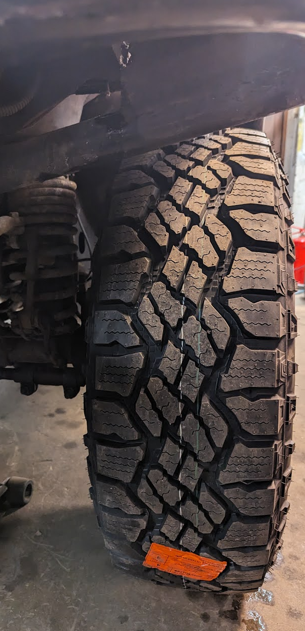 Pizzaleikkurit on kokoa 255/70R18 ja ilman painoa halkaisija noin 82cm, kulutuspinnan leveys 21cm, pääuran syvyys 1cm. Merkintöinä sekä M+S tälle talvelle ja ens vuodelle sitten POR. Lisäksi joku ihme LR leima, tässä autossa on siis Jeepin, Fordin, Volvon ja BMW lisäksi Land Roverin osia