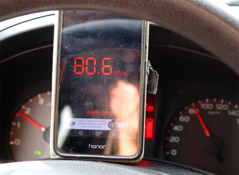 Metkosta takaisinpäin ajellessa oli aikaa kuvailla kun oli vaimo ja älypuhelin mukana. Mittari heitti sen verran kuin kuvittelinkin eli aika oikein näyttää. Kuvissa neula tasan 80:ssä ja satkussa. Vitonen on vaihteena ja renkaina 235/85-16. Auton vuosimalli 2014.