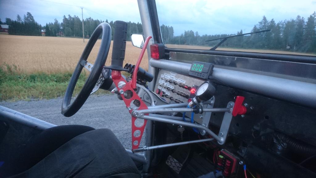 Loppujen lopuksihan tässä ei ollut muita muutoksia alkuperäiseen kuin akselintuenta, etujarrut, moottori ja vaihteisto ja akseliväli ja kaaret. Näyttää hullun korkealta ja hurjemmalta koska helmoja ja kaaria on nostettu 9cm ylöspäin, todellinen korkeus muuttunut alkuperäiseen 125mm renkaineen päivineen. Asianmukaisesti prosentit tuli kaikista tehdyistä muutoksista penkkejä ja ovia myöten. Vähän jäi varaa että pystyy turbon vielä laittaa joskus. Katsuri kehui että asianmukaisesti akselit tuettu pari lappua piti vielä hakea kesken operaation että sai leimaan.
