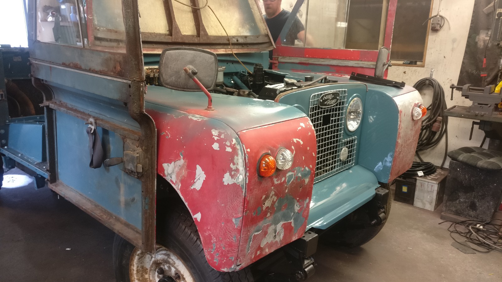 Land Rover Series 2A -68Jossain threadissa vilahti pyyntö, että lisää series-projekteja. No tässä ainakin yksi. Kyseessä on siis -68 vuosimallin 2A. Moottorina on toimii ikilaiska ja pirteä 2,25 D roverin diesel. Auto löytyi Etelä-Suomesta 2017 joulun alla, josta se sitten lavetilla siirrettiin pohjoiseen. Auto oli kerennyt seisoa ~15 vuotta, ennen kuin se minun omistukseen päätyi. Runko oli nähnyt parhaat päivänsä jo ajat sitten, mutta moottori pyörähti vauhtipyörän päästä käsin, joten toivoa oli. Lähtötilanne: -Runko laho siinä kohdin, missä sitä oli jäljellä -Kytkin jumissa -Jarrut kadonneet -Sisustasta puutui penkit ja se oli roiskittu vihreäksi, takaikkunoita myöten. -katto näyttää kuin sen päältä olisi laskettu liukumäkeä. (Ja näyttää edelleen. Jos jollain olisi myynnissä peltiosia, niin olen TODELLA kiinnostunut) -sähköt aivan jotain käsittämätöntä. +moottori tuntui liikkuvan +pellit on alumiinia. +Hyvät kesärenkaat, joilla ei todellisuudessa ollut mitään käyttöä, kun nappulat piti saada. +No onhan se kumminkin Land Rover. Joulun välipäivät (ja vähän aattoakin) vietetiin tiukasti tallissa. Moottoria elvyteltiin, jarruja heräteltiin henkiin, kytkin uusittiin. Moottorin elvytys tuotti monenlaista "iloa". Sähkö kulkusuunta oli hieman ollut jollekkin epäselvä, kun virta- ja maakaapeli tulivat molemmat samaan napaan startissa. Tämä vika paikantui savun saattelemana. Startti kuitenkin pyörähti iloisesti, kunhan johtojen päätepistetä hieman korjailtiin. Käyntisavuista ei kuitenkaan ollut mitään tietoa. CAV:in ruiskutuspumppu käytettiin pöydällä, mutta mitään vikaa ei löytynyt. Lopulta useiden ilmausyritysten jälkeen alkoi pakarin tiivisteen välistä nousta lupaava savu ja vanha dieseli pärähtikin tulille. Näin sivumennen sanoen, käynnistymisvaikeuksia ei ole tämän jälkeen ilmennyt. -30 asteen pakkasessakin kone heräsi reilun hehkutuksen jälkeen, kuin palmun alta. Savua kyllä sitten riitti. Niin paljon, ettei tallissa voinut olla. Sekin loppui kunhan hoksattiin, että pumpun ajoitus oli käännetty niin myöhäiseksi, kuin on mahdollista. No mehän laitettiin vastakkaiseen laitaan ja savut loppu. Jarru- ja kytkinremonttia sitten loppu loma, mutta varsinainen savotta alkoi joskus helmikuun tiennoilla. Autoa kuitenkin päästiin kokeilemaan tässä välissä ja todetiin, että neliveto ei pelaa. FAG. Syy löytyikin hyvin nopeasti, kun irroitin etuvetarit murikan irroitusta varten. Vasemmalta puolelta tuli vetari ilman booreja. 10cm palanen löytyi myöhemmin tasauspyörästöstä. Helmikuussa purettiin autosta kaikki pois rungon päältä. Akselit irroitettiin ja runko nostettiin kärryyn ja ajettiin hiekkapuhallukseen. Hiekkapuhalluksen jälkeen todettiin, että runko on todellakin laho joka kohdasta. Epätoivo hiipi otsalle, mutta eipä se auttanut kuin alkaa leikkaamaan peltiä ja hitsaamaan. Positiivista oli, että turhia muotoja ei ollut, vaan kaikki oli palkkirakennetta. Työ eteni kuitenkin suhteellisen nopeaa. Peltiä kului 2,5 m^2 ja lankaa tarvittava määrä. Hitsattu runko maalatiin pari kertaa epoksi- ja polyuretaanimaaleilla. Ainoa korotus, mikä autoon tehtiin, oli takimmaisten henkselien jatkaminen, jotta auto saatiin suoraan. Akselit takaisin runkoon joskus kesäkuussa (haave juhannusleimasta oli haihtunut jo aikaa sitten). Myös moottori ja laatikko paikalleen. Tässä välissä käytettiin laatikko irti ja vaihdettiin levy, joka olikin valmis vanhainkotiin. Tehtiin myös kaikkea muuta epäkiinnostavaa pikku hommaa. Kori päätettiin jättää suurimmaksi osaksi koskemattomaksi, koska metsästykausi alkoi painaa uhkaavasti päälle. Maalasimme kuitenkin tuli ja maskin. Elokuussa nostetiin kori takaisin paikalleen ja alettiin kasaamaan hilppeitä paikalleeen. Sähkötkin saatiin toimimaan, mutta vaati useita iltoja ja loputonta yleismittarilla oikean johdon etsintää. Polttoaineanturi, kaikki lamput ja lämpötila-anturi uusittin. Alkuperäinen puhallin sen sijaan toimii ja lämmittää. Sisätilat saivat uuden sisustuksen. Penkit löytyivät romuttamolta Peugot Boxerista tms. Sisustusken kanssa sattui semmonen "erehdys", että "unohdin" äänieristyksen. Lopputulos on, että pitkillä matkoilla Peltorit ovat pakolliset . Pitää tehdä asialle jtn talvella. Syyskuun puolessa välissä kaikki oli paketissa. Uudet rattaat alla. Tilasin Brittanniasta 16" vanteet ja niiden päälle kietaistiin Hankookin Dynapro MT RT03:set. Katsastusmies oli alkuun varsin nuiva, kun näki auton. Eihän se mikään kaunis olekkaan Ilme kyllä kirkastui, kun huomasi, että auto on oikeasti käyty huolella läpi ja ulkomuoto hieman pettää. Leima ekalla yrityksellä ja jarrutkin ekalla polkaisulla lävitte. Tulevana talvena sitten mahdollisesti maalausta ja muuta mihin nyt rahat riittää.