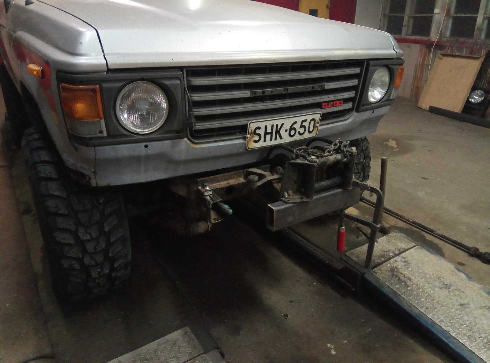 Tuon näköinen nyt. Trukkilavalla lepää mekaaninen vinssi josko sen joku laittais paikoilleen. Takapuskurin sovittelua. Painaa ihan saatanasti, 6millistä