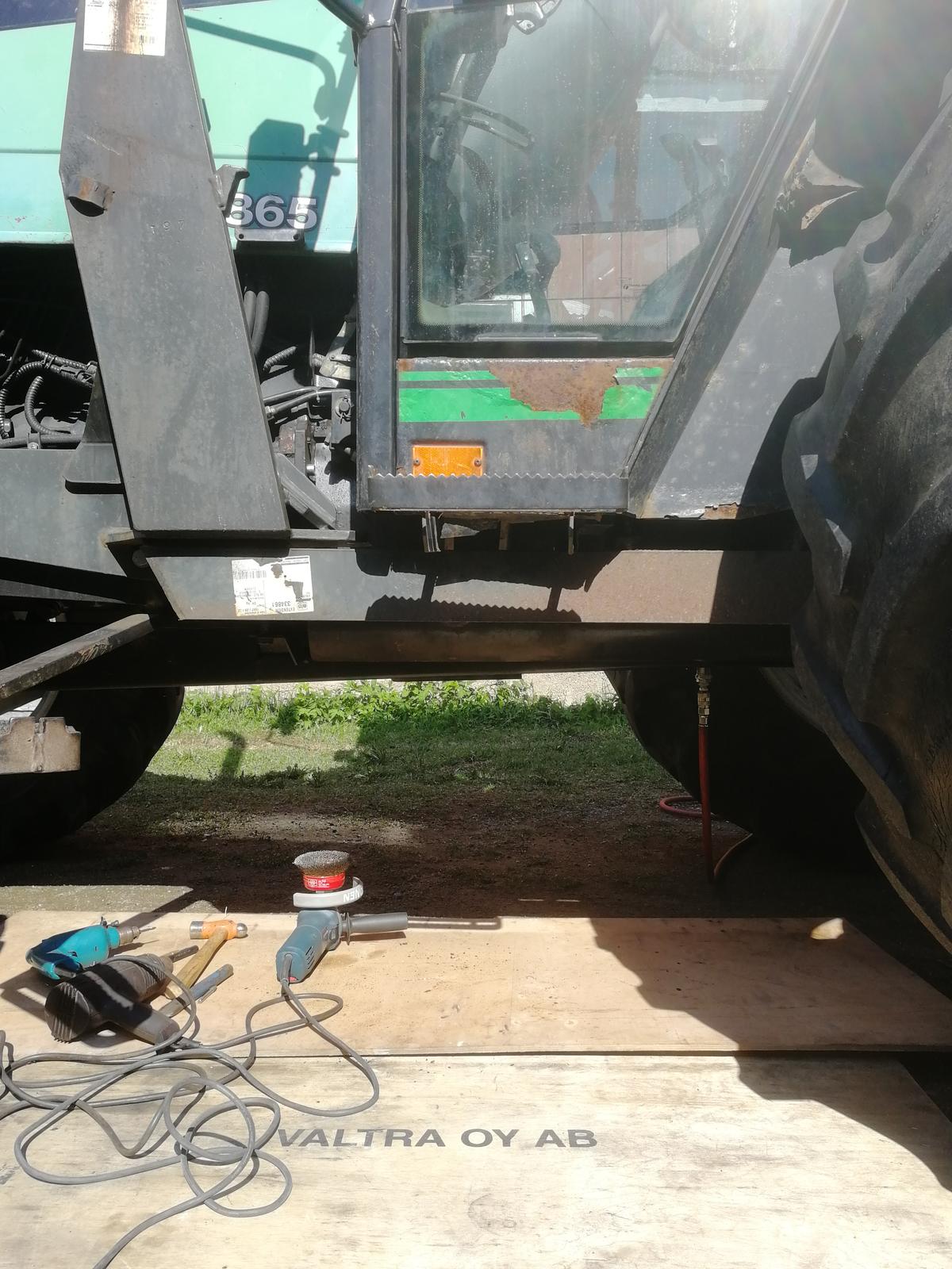 Ennen hitsauksen aloittamista tyhjensin polttoaine tankin ensin lappamalla jerreyihin ja sen jälkeen tankin tyhjennysropusta laskemalla pois loput polttoaineet. Annoin tankin tuulettua muutaman päivän ennen hitsaamista. Ennen hitsaustyön aloittamista laitoin paineilmaletkun tankin tyhjennysropun reikään ja tuuletin tankkia paineilmalla. ennen hitsausta tein laikkakoneella railoa murtuman kohdalle ja porasin murtuman päihin reijät ettei murtuma enää jatku. hitsaukseen käytin esab OK 48.00 hitsauspuikkoja jotka toivottavasti oli kyseiselle tankin teräkselle aliluja lisäaine korjauksen onnistumiseksi. Hitsaus puikot olivat esabin vac pak pakattuja eli tyhjiö pakkauksessa kosteuden torjumiseksi eli hitsaukseen käytettiin kuivia hitsauspuikkoja vetyhalkeamien ehkäimiseksi. Seuraavaksi aloitin hitsauksen, jota tauotin useasti ettei riskinä ollut polttoaine tankin kuumeneminen. Kieltämättä hiukan jännitti hitsata kyseistä kohdetta ja polttoaine tankin täyttö aukosta tuli hitsauksen aikana ja jälkeen pakokaasun haju sekä savua. Hitsauksen korjauksen kohtaan tuli monipalkohitsausta vierekkäin sekä päällekkäin johtuen ohkaisista hitsauspuikoista ja näillä sai rajattua hitsauksen lämmöntuonnin mahdollisimman pieneksi. Hitsauksen jälkeen hioin sauman jouhevaksi jouhevan liittymän varmistamiseksi perusaineeseen ja ohjaamon kannakkeeseen ettei uutta repeämää tulisi jyrkän hitsausliittymän vuoksi.