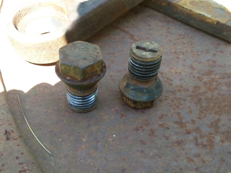 Koneen mukana tuli hervoton (85cm pitkä) pakki missä oli pääosin vaihdettuja letkuja. Pohjella oli jotain työkalujakin, sylinteriavaimia sun muuta ja tuo KVX:n leka-avain minkä olin unohtanut. Tuo avain ja 12kg leka teki hommat eikä ollu edes tiuksaas noilla työkaluilla. Rautakangella tosin piti irroittaa avain pultista. Pultit on jengan harjalta mitattuna 27mm. 3mm nousu kierteessä 3mm. Lähtötilanteessa hämäsi tuo uraruuvin kannalta näyttänyt ura pultin päässä. Tarkoitusta en tiedä vieläkään. Vinkkejä jos joku tietää mistä saisi tollasia 27x3mm muovisia tulppia mitä voisi vetää tyhjiin reikiin jos joskus tarttee asentaa levy takaisin. Viimeksi muokannut Säätäjä_setä : 31.05.2019 23:42 |