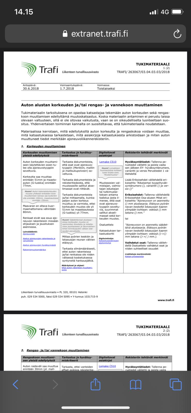 Ajoneuvon alkuperäisen jousituksen muuttaminen on sallittua niin, ettei se vaikuta ajoneuvon alkuperäisen sisään/ulosjouston määrään." Tuossa ei puhuta jouston rajoittumisesta, vaan määrän muuttumisesta. Eli jos tarkkaan luetaan niin periaatteessahan joustovarat eivät siis myöskään saisi lisääntyä?