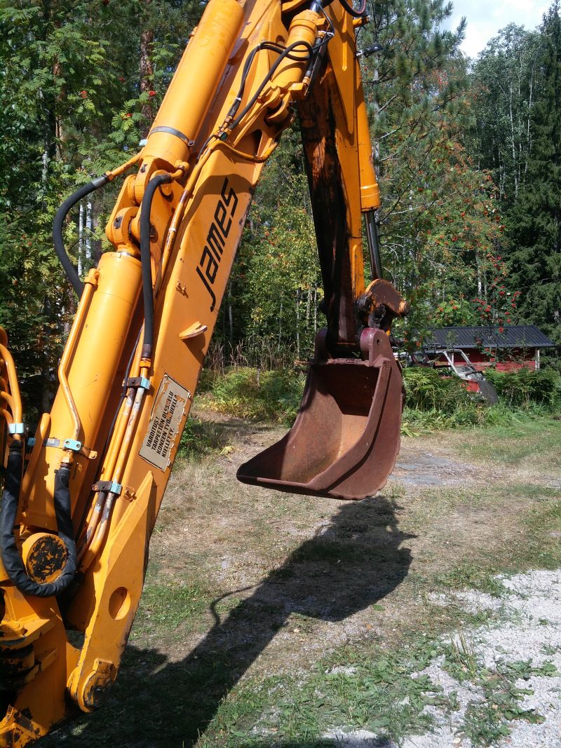 Viikonloppuna oli hienot ilmat. Herättelin Jameksen talviunilta. Päävirtakytkin vittuili minkä jo tiesinkin, mutta muuten laakin peli ja heti hommiin. Tai tarkemmin ennen sitä talven remontissa ollut radio kiinni ja rokki soimaan. Naapurin ukko kysyi tulisinko nostamaan pari kantoa. Oli omassa yrityksessä rikkonut jo traktorin juontokouran (kanto #1, oikea). Tiivis savimaa ja tuoreet täyskokoiset puut niin kyllähän ne kiinni on. Ittellä sattu olemaan kaapelikauha kiinni ja en jaksanut ruveta vaihtamaan. Ehkä vähän enemmän kaivelua, mutta molemmat nousivat. Kostean savijänkin kaivaminen on perseestä kun väistämättä jää kauhaan kiinni.