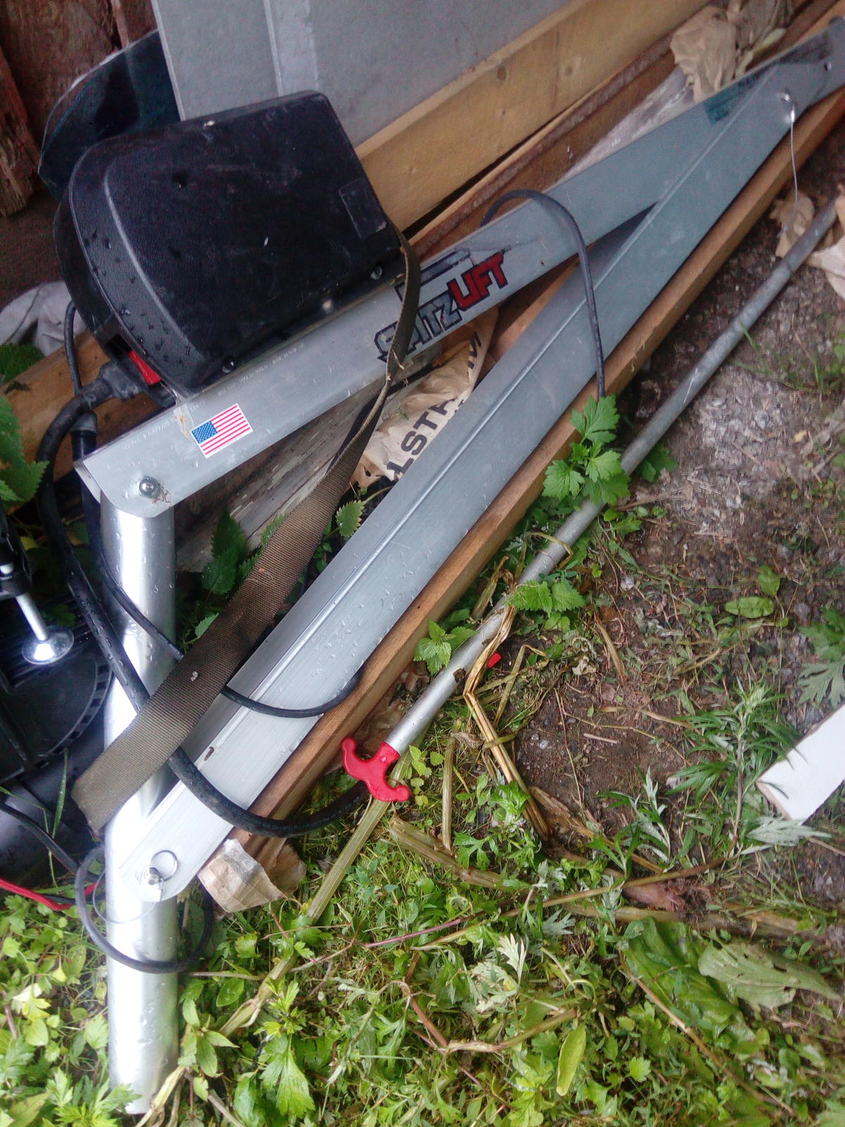 Pelkästään kouruissa kiinni. On tuossa tartuntapintaa monta kymmentä senttiä. Nosturin nostokyky 400 kiloa, koenostossa selviää kunhan saan sen asennettua.